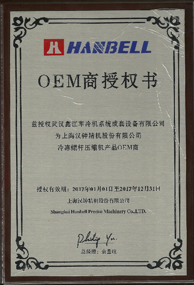 汉钟OEM授权证书